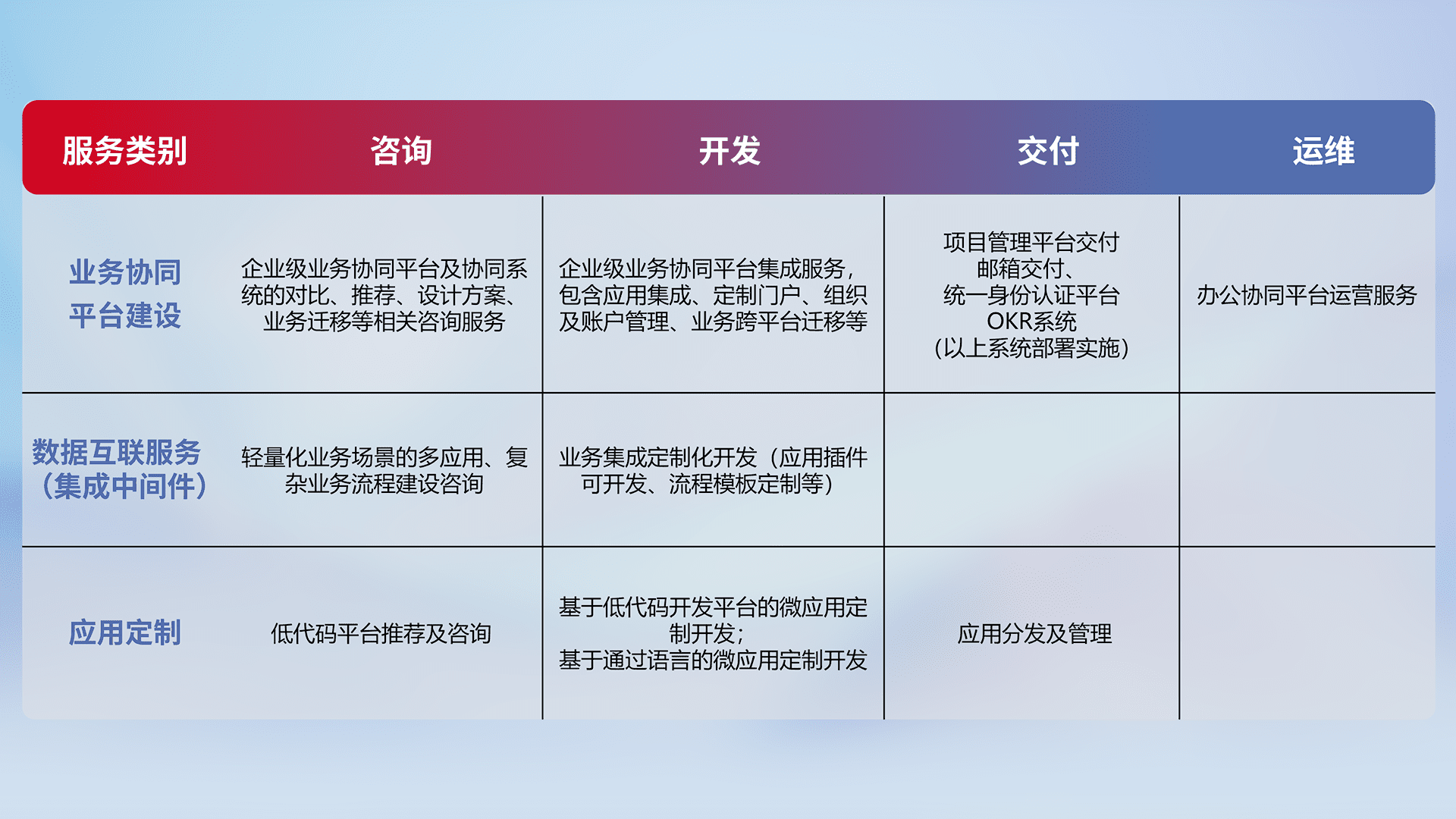 针对钉钉、、、企微、、、、IDaas等平台级产品提供产品的规划、、、方案、、、交付、、定制化开发等服务,,,实现如统一协同办公、、、智能客户服务、、混合会议管理、、智能数据查询、、等业务场景,,实现数字化转型。。