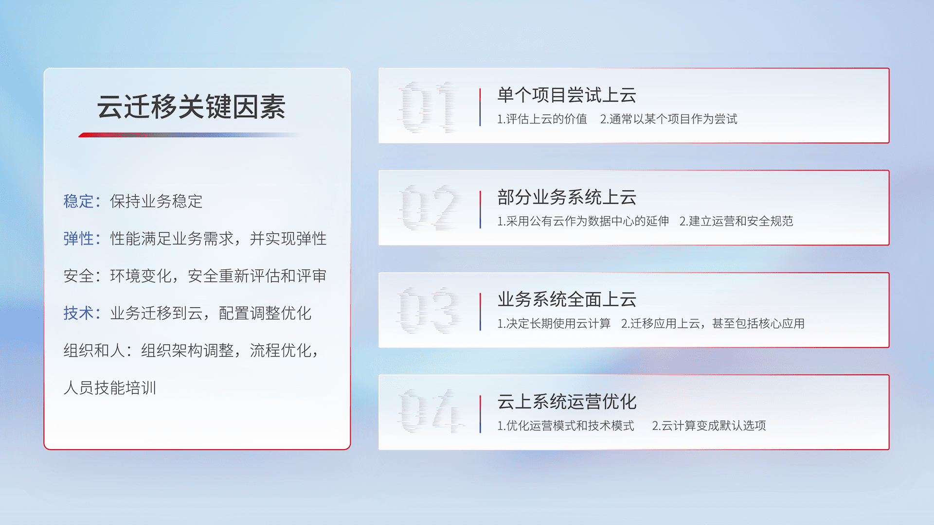 结合实际业务,,从规划设计、、、云平台选型、、、云原生改造、、数据迁移、、、、集成交付,,,,迁移全过程为客户识别最佳上云路径,,做好风险识别管理,,,,设计网络架构、、、、身份权限、、安全审计合规、、、、操作审计、、、、日志审计、、监控告警策略、、、、多站点容灾设计等,,,,对云上基础设施进行整体规划,,,,提升IT治理水平,,以满足弹性、、、高可用、、高性能的需求。。。