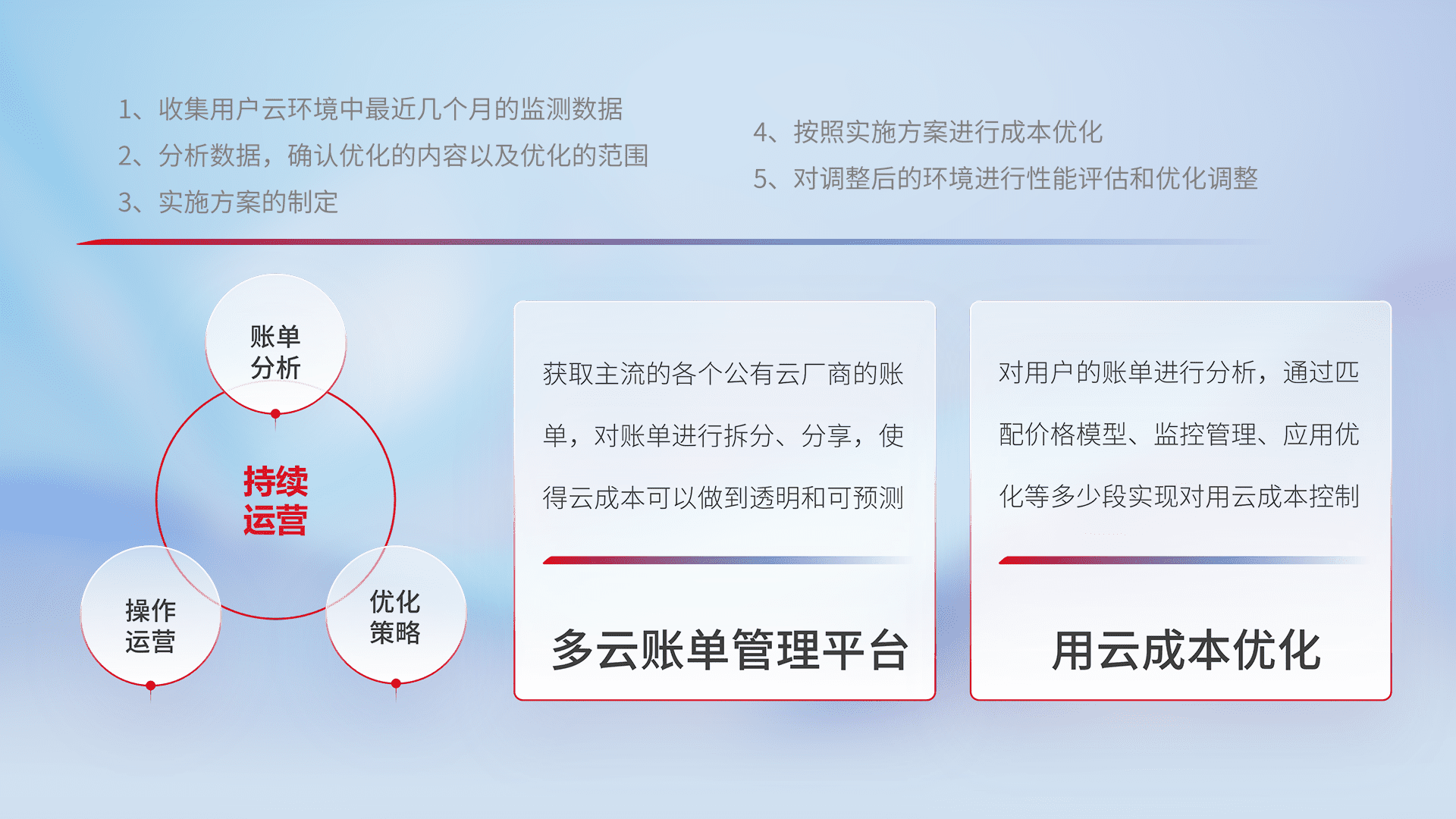 通过多云纳管,,,以统一的资源数据模型把客户的云资源进行抽象和封装,,,,进而实现对多云资源的统一操作,,保障云资源管理的可靠性、、稳定性与可用性。。量身定制化运维内容,,配置、、、、开发运维、、、、补丁管理、、备份、、、监控、、、认证和访问管理、、、、审计和日常巡检等,,保障在用云过程中的可靠度,,,,稳定度以及高可用率。。。
